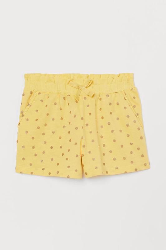 Летние яркие шорты с блестящими кружочками для девочки фирмы Н&М. Пояс на широкой резинке, декорирован бантиком. Очень быстро и легко одеваются. Боковые карманы с рюшами для полезных мелочей. Удобная повседневная моделька, отлично подойдут для прогулок и подвижных игр в летние жаркие дни. После стирки не теряют первоначальную форму и цвет. Сделаны из очень качественного натурального трикотажа. Состав: 100% хлопок, джерси Размеры: 4-6 лет на рост 110/116см Пот - 26см, длина шортиков от пояса до низа по спине - 25см