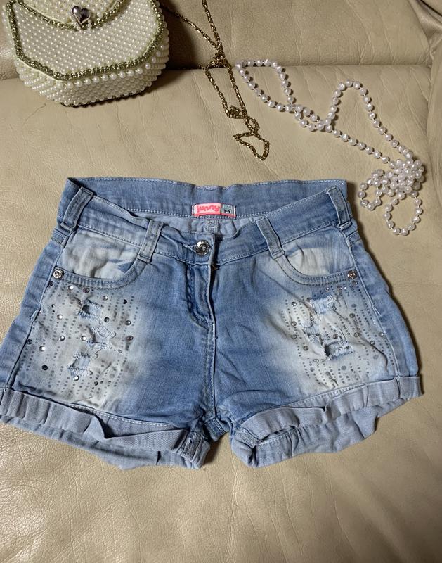 Модные джинсовые шортики на девочку ,рост указан 134.ПОТ 29 см,ПОБ 37 см,посадка 18 см,длина 26 см
