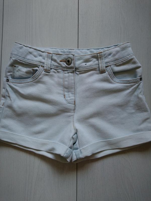 Джинсові шорти в дуже хорошому стані Пояс стягується резинкою на гудзичках На вік 6-7 років Довжина з боку 24 см Посадка спереду 21 см Півобсяг пояса 27-28 см і стягується Півобсяг бедер 36 см Матеріал котон