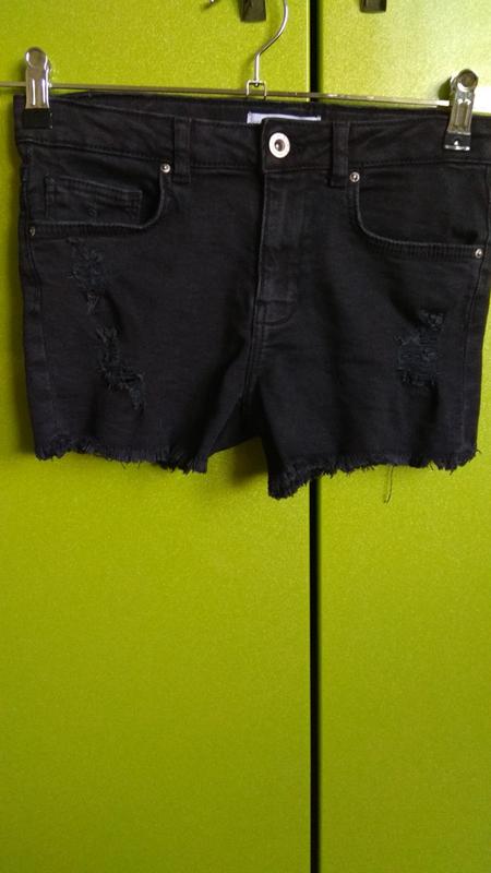 Стильные джинсовые шорты с фабричными рваностями на 11-12 лет. Замеры :полупояс 34 см (есть утяжка), полуОб 39 см, длина по боковому шву прим 26,5 см, высота посадки спереди 22 см, сзади 26,5-27 см.