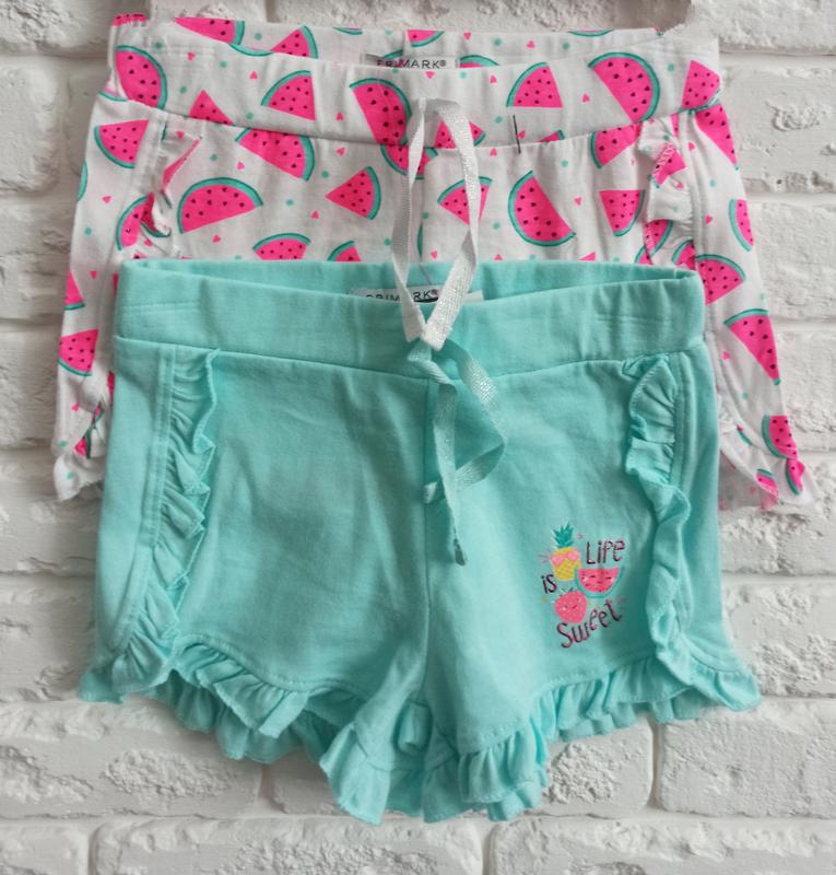 Шорты Primark комплект из 2 штук с фруктовым принтом. Размеры: 104: длина 21см, ширина по талии 25см, по бедрам 29см. 110: длина 22см, ширина по талии 26см, по бедрам 30см. 116: длина 22см, ширина по талии 27см, по бедрам 30см. 122: длина 24см, ширина по талии 27,5см, по бедрам 30см. 128: длина 24см, ширина по талии 29см, по бедрам 33/34см. Состав ткани: 100% котон. Страна-производитель: Индия