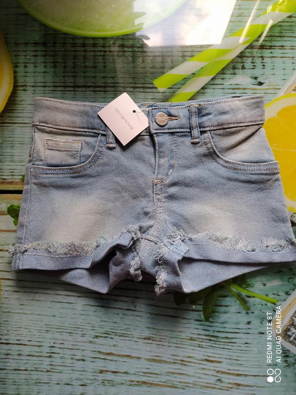 Нові джинсові шорти на дівчинку трьох-чотирьох років,якісь гарна заміри:довжина 16 см обхват талії 50 см талія зменшується за допомогою резинки. Пишіть будь ласка зроблю додаткові фото.