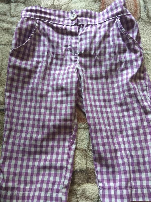 Отличные коттоновые бриджи на девочку ростом 98 см. В очень хорошем состоянии. Ткань плотная. Сзади в поясе есть широкая резинка. Длина - 39 см, шаговый шов - 22 см.
