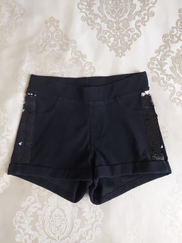 Шорты из мягкого котона. Немного тянутся. По боках пайетки -переверташи. Состояние идеальное. Замеры на фото.