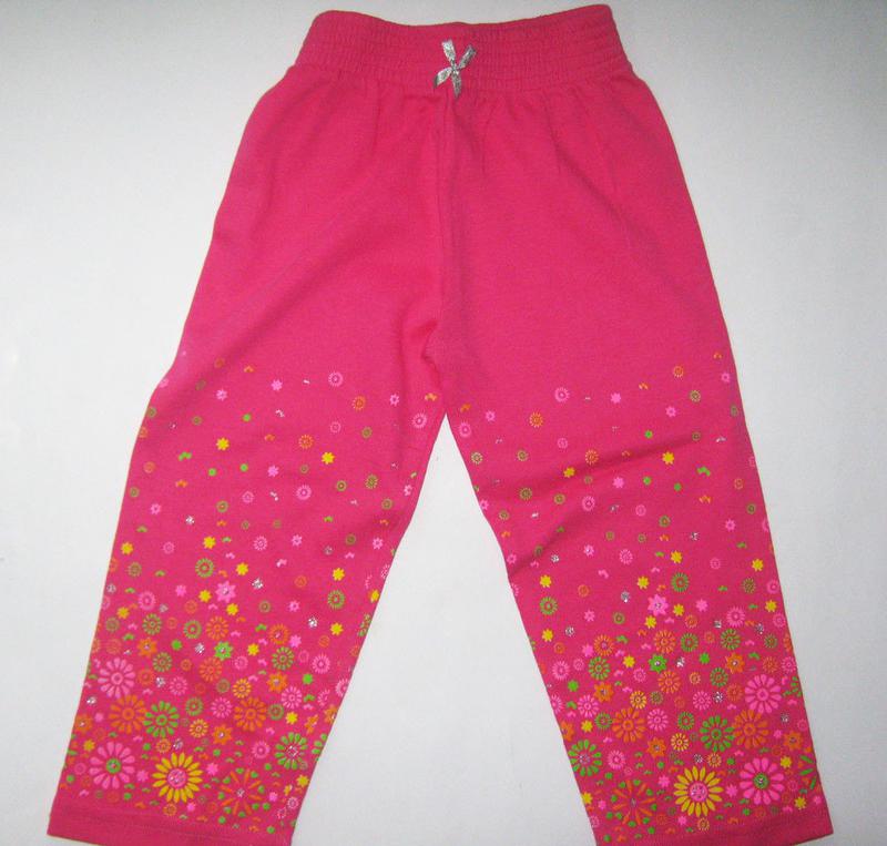 Бриджи для девочки Размер 98, 104, 110, 116 Выполнены качественного трикотажа. На трикотажной резинке Внизу штанин украшены рисунком. Состав 90 % коттон, 10% эластан Цвет малина, салатовый Размер 98, 104, 110, 116