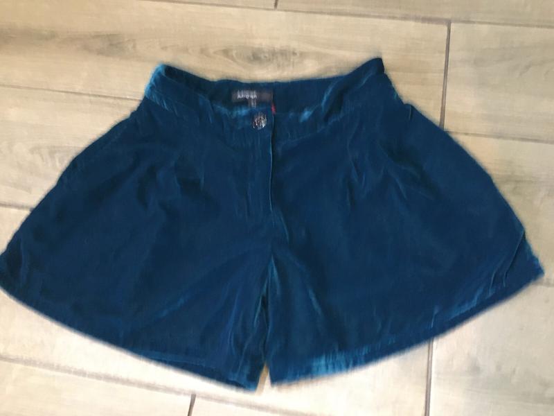 Стильные модные красивые шорты юбка ! Шикарный изумрудный цвет ( фото не передало ) ! Бархат на подкладке ! Есть два кармана ! Отличное состояние ! Указано на 6-7 лет ! Мы носили до 9-им ! Длинна 29 см пот 28 см ( есть утяжка )