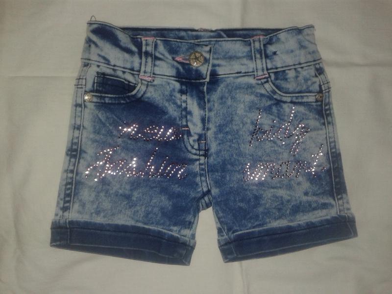 Джинсовые шорты для девочки. Размер - 4 года ( рост 104 см ), но мы носили до 5 лет. Производство - Турция. Все стразы на месте. По бокам, на внутренней стороне шорт есть резинка для регулировки посадки по талии. Фирма - Yavrucak.