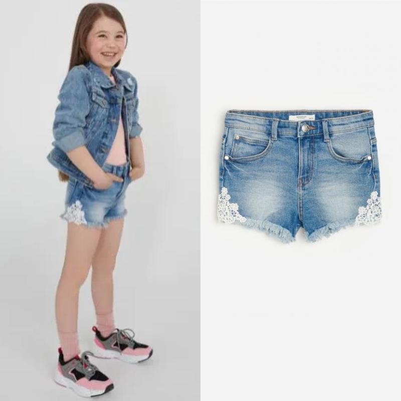 Джинсові шортики фірми Reserved. Шортики відмінної якості,знизу з боків ажурні вставки білого кольору, знизу бахрома. Кишені з боків і ззаду. Є всередині стяжка на поясі. Склад: 99% бавовна, 1% Розмір: 5-6 років на ріст 116см ПОТ - 26см, довжина від пояса до низу - 21см