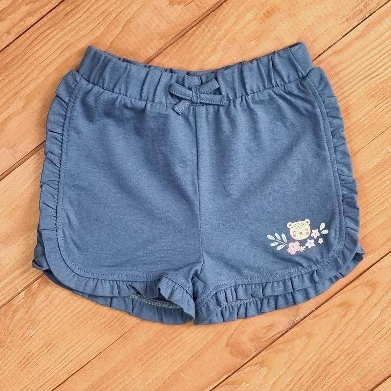 Трикотажные шортики для девочки с цветочным оформлением. Цвет: Морской Состав: 100% хлопок. Рост 62 (2-3 мес.) - Длина 17 см, посадка спереди до шва 16 см, ПОТалии 18,5 см, ПОБедер 26 см.