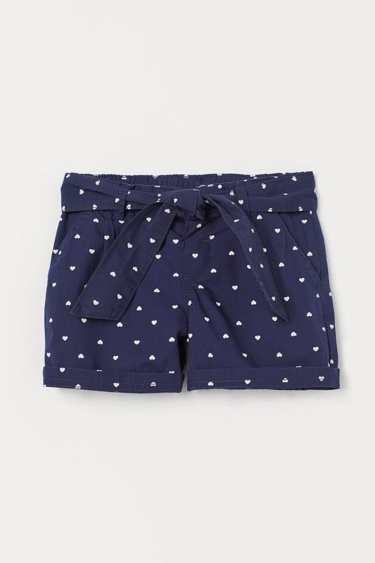Стильные, удобные шорты на девочку с поясом. Цвет темносиний в сердечки. Есть два кармана. Ткань приятная на ощупь, легкая - рубашечная, не тянется. В поясе есть утяжка. Ширина в поясе 30см Длина 28см