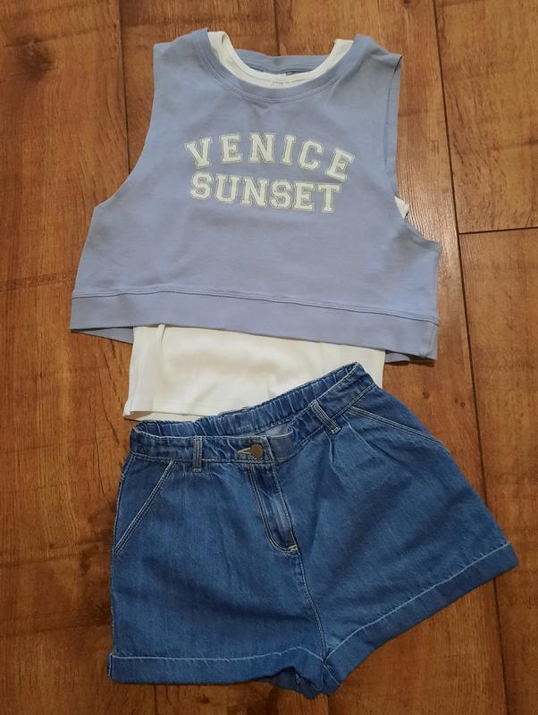 Джинсовые шортики на девочку. Ширина пояса регулируется. Спереди элегантные выточки и боковые кармашки. Размер: 10 лет (рост 140 см) ПОТ - 32см ПОБ - 40см Высота бокового шва -28см Высота ширинки - 14см