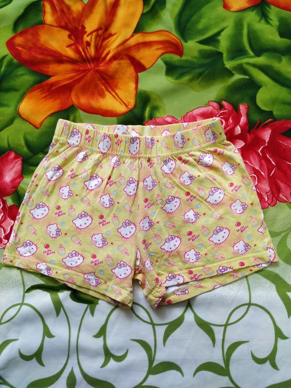 Шорти з кіті для дівчинки 5-6 років в ідеальному стані. Довжина-23 см,пояс-25 см,бедра-35 см.