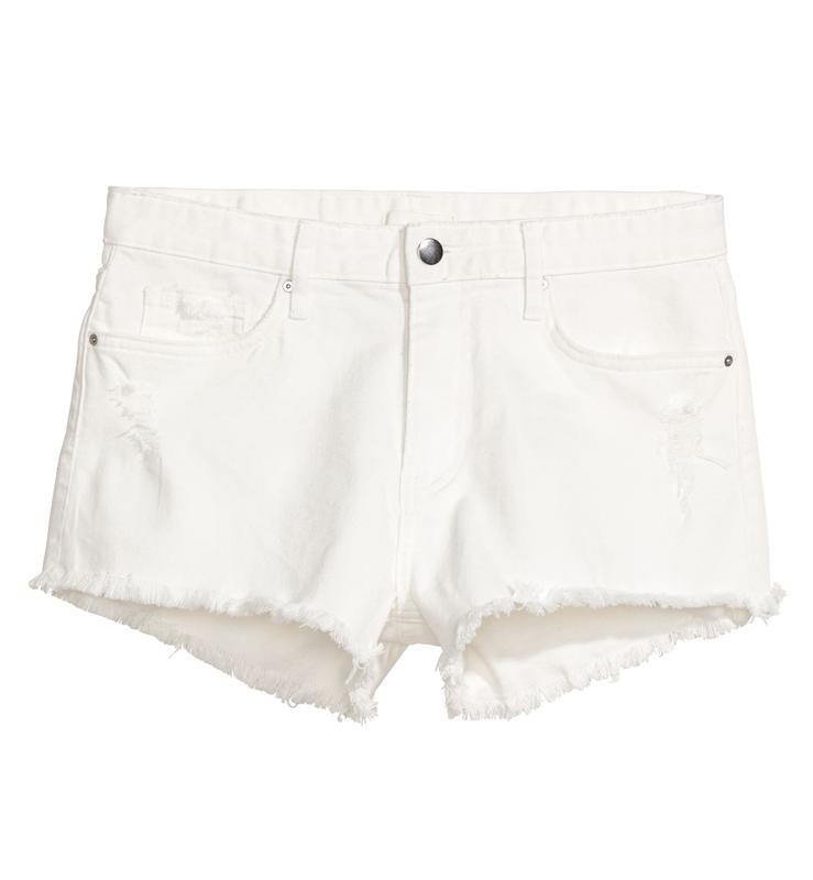 Короткі шорти з 5 кишенями з випраного еластичного деніму з потертими деталями, звичайною талією, блискавкою та необробленими краями. Довжина 23см. Пояс 33см. Посадка 28см.