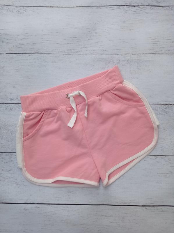 Легкі шортики для дівчинки Primark. Ніжно-розового кольору, збоку білі вставки, зручні кишеньки. Тканина двохнитка, натуральна, не парить 58% бавовна 42% поліестер. Широкий пояс - резинка. Розмір вказаний 4-5 років (110 см), будуть довше орієнтуйтеся на заміри: Довжина від поясу по боковому шву - 22 см Довжина переднього шва (від поясу до низу, перехрестя швів) - 23 см Задній шов (від поясу, по попі) - 25 см Ширина в поясі -25 см Ширина в нозі - 18 см. Допустима похибка в замірах 0,5-1,0 см.