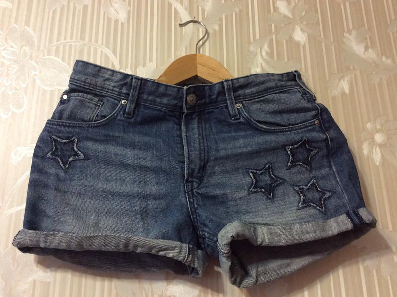 Стильні джинсові шорти demin з аплікацією у вигляді зірок на 170см зросту 14+ років Бедра на 90см Талія на 70см Джинс хорошої якості Виготовлено в Бангладеші Купувались в Німеччині