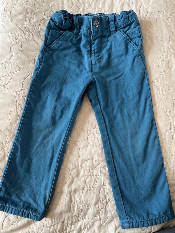 Брюки темно бирюзового цвета. С тонкой коттоновой подкладкой. Полуобхват талии 26см Полуобхват бедер 30см Длина штанги от проймы 37см Без дыр, пятен или потертостей. Ношени мало - доня любит только лосины и отказывается их носить. Подойдут от 2-х рочков, если подвернуть штанику.