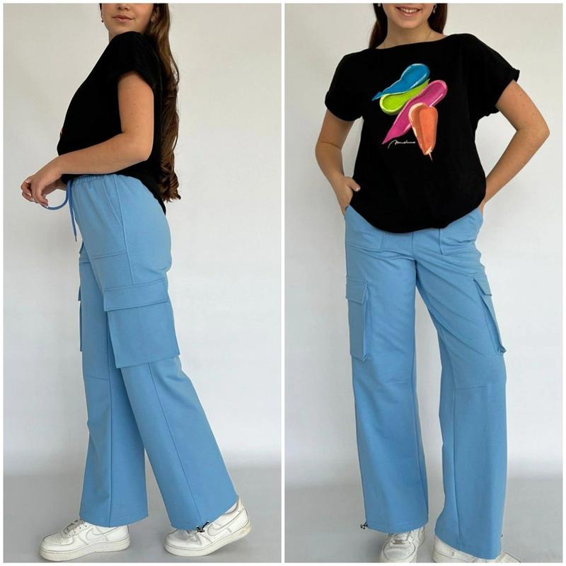 нов мод Трендовые брюки КАРГО пошиты из качественной турецкой двухухнити качества пене 🌿Пояс на широкой резинке,дополнительно в поясе также есть завязки из шнурка 🌿 Спереди вверху расположены удобные накладные кармашки, а ниже по бокам нашить большие накладные карманы с клапанами 🌿 Края низа брюк прямые, с резинкой в подгибе, которую можно стягивать 📌152(1шт)-95\69\28 📌158(1шт)-99\72\29 📌164(1шт)-103\75\31