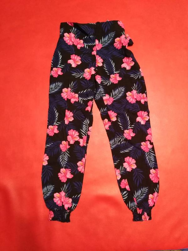 Тонкие летние брюки с веселым цветочным принтом. Размер 128, 7-8 р. Сзади на резинке и на завязке. Штанки внизу на резинке. Длина 72 см, ширина 28 см.