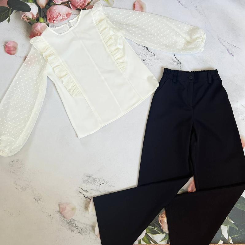 ◦ Артикул: 8378 Блуза для дівчинки «Яніна» Розміри: 122,128,134,140,146; Тканина : Софт, шифон жаккардовий; Ціна: 375 грн Кольори: білий, молочний ◦ Артикул: 8377 Брюки для дівчинки «Влада» Розміри: 122,128,134,140,146,152 Тканина : Костюмний текстиль; Ціна: 485 грн