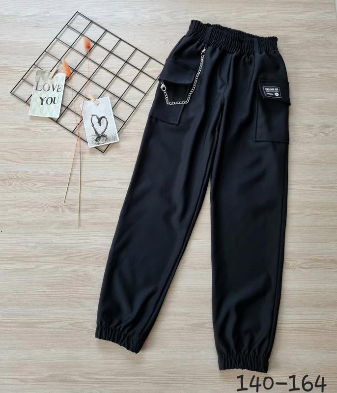 Модные джоггеры карго ткань тиар трикотаж имеют два действующих накладных кармана декоративная цепочка (можно снять) низ брюк и пояс на резинке нашивка может отличаться 140(3 шт)-длина 84, крок 58,пояс 26 146(3 шт)-длина 86, крок 62,пояс 27 152(3 шт)-длина 90, крок 65,пояс 28 158(2 шт)-длина 93,шаг 67,пояс 29 164(3 шт)-длина 95,шаг 69,пояс 30 +-2см