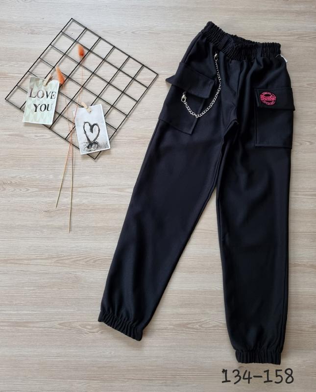 Модные джоггеры карго ткань тиар трикотаж два действующих внутренних кармана + два накладных кармана декоративная цепочка (можно снять) низ брюк и пояс на резинке 134(2 шт)-длина 81,шаг 58,пояс 25 140(2 шт)-длина 84,шаг 59,пояс 26 146(1 шт)-длина 86, крок 63,пояс 27 152(1 шт)-длина 90, крок 65,пояс 28 158(2 шт)-длина 93,шаг 67,пояс 29 +-2см