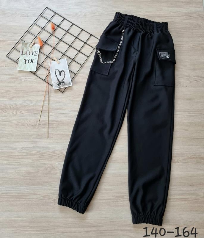 В НАЯВНОСТІ!!! Модные джоггеры карго ткань тиар трикотаж имеют два действующих накладных кармана декоративная цепочка (можно снять) низ брюк и пояс на резинке нашивка может отличаться 140(2 шт)-длина 84, крок 58,пояс 26 146(2 шт)-длина 86, крок 62,пояс 27