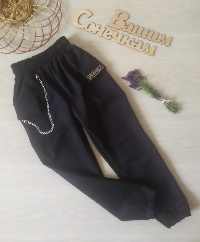 Новинка джогери -карго😍😍😍 ткань : алекс трикотаж люкс качества -комфортные -хорошо садятся по фигуре -есть два накладных кармана -в поясе резинка, красиво тянется, не тугая -по низу манжеты на резинке -цепочка снимается при необходимости цвет черный производитель Украина💙💛 134см 140см 146см 152см 158см замеры: длина/шак/пояс в не растянутом виде 134: 82см/58см/25см 140: 84см/61см/26см 146: 89см/66см/27см 152: 92см/67см/28см 158: 95см/68см/29см допустимо похибка +-2см