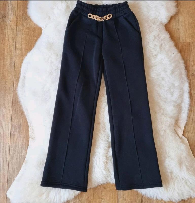 модн Теплые палаццо! В поясе резинка. Цвет - черный. Ткань -турецкая трехнить пенье на байке. Замеры: 134 длина - 81см, шаг - 61см, пояс - 25см, полуобхват бедер - 40см. 146 длина - 89см, шаг - 67см, пояс - 27см, полуобхват бедер - 43см. 158 длина - 99см, шаг - 76см, пояс - 30см, полуобхват бедер - 45см. 164 длина - 103, шаг - 81см, пояс - 31см,, полуобхват бедер - 46см.
