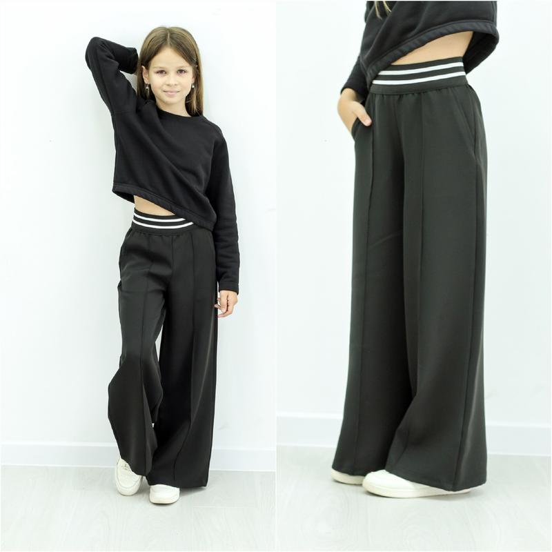 Стильные Брюки палаццо для красавиц 💗 идеально для школы и на каждый день 😍 Классика, пояс широкая резинка хорошо тянется, есть карманы Выстрочка спереди Ткань брючная «Барби», чуточку эластичная Размеры 134-158 Замеры: длина/шак/пояс/бедра 134 - 87/60/27/41 140 - 92/64/28/42 146 - 95/66/29/43 152 - 97/69/30/44 158 - 102/73/30/47