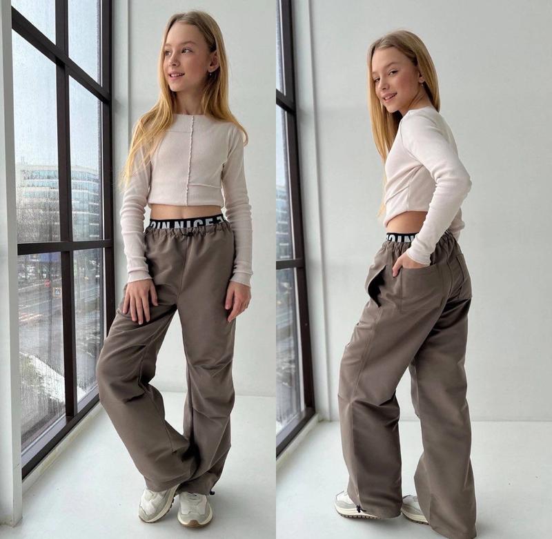 арт 4448 Хит сезона!! Карго-парашуты Ткани турецкий коттон с легкимстречем По низу затягиваются по талии также резинка и утяжка есть карманы Хорошее качество ПОЛНОМЕРНЫЕ. Рост/длина/шак/пот/поб похибка+-2см 146/90/64/28/44-2шт 152/93/67/29/45-2шт 164/100/73/31/47-2шт Тан