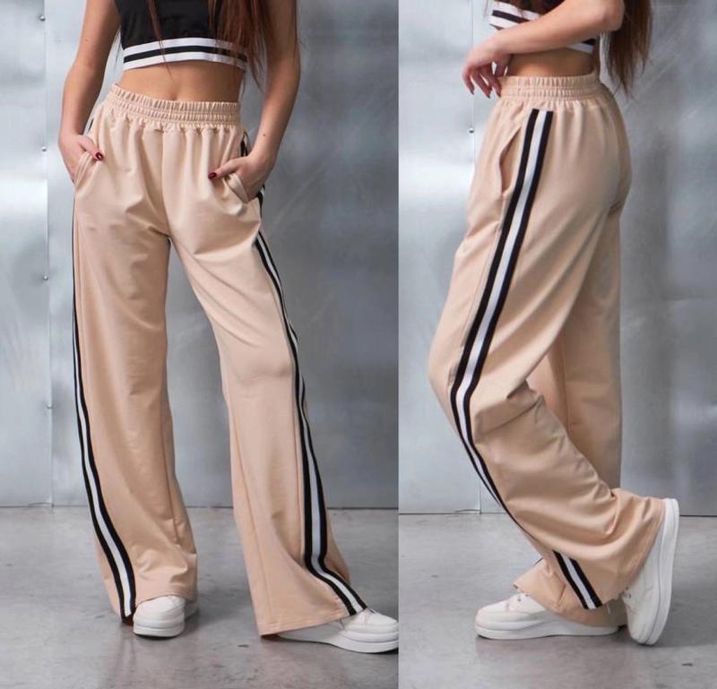 через кнопку купить только полная оплата!!! арт 4309 Новинка сезону очень крутые брюки палаццо в стильном дизайне крутой лампас пояс под резинку ткань турецкая двухнить пенье не кашлатиться рекомендую рост/длина/шак/пот/поб похибка+-2см 140/92/66/28/47-2шт 146/95/70/28/49-2шт Тан