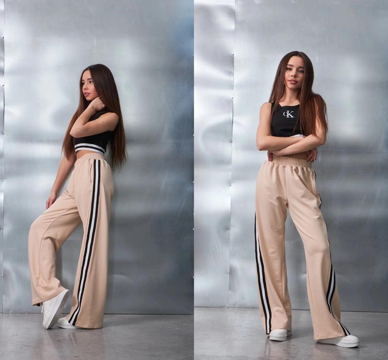 Стильні штани палацо для красунь 💗💗💗 модний лампас по боках пояс широка резинка, гарно тягнеться тканина турецька двонитка пеньє Не кошлатиться Заміри: довжина/крок/пояс/бедра 140 - 92/66/28/47 152 - 99/73/29/51 158 - 102/76/30/52 164 - 105/78/31/53