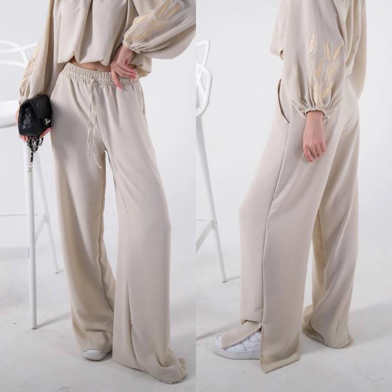 Новинка Палацо легкие и удобные из ткани креп-жатка с боковыми разрезами по низу в поясе под резинку и веревку есть карманы РЕКОМЕНДУЮ! цена 610 грн рост/длина/шак/пот/поб похибка+-2см 158-164/98/72/28/48-1шт
