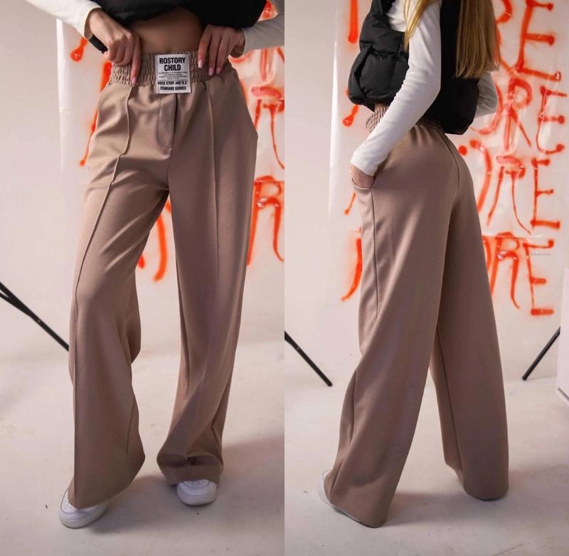 Арт 4354 Брюки палаццо-трубы С карманами В поясе под резинку Спереди прошитая высточка Ткань плотная двунитка пенье Хорошее качество! Рост/длина/шак/пот/поб похибка+-2см 140-146/93/64/27/44-1шт 152-158/98/69/30/46-2шт 164-170/105/77/33/49-2шт Тан