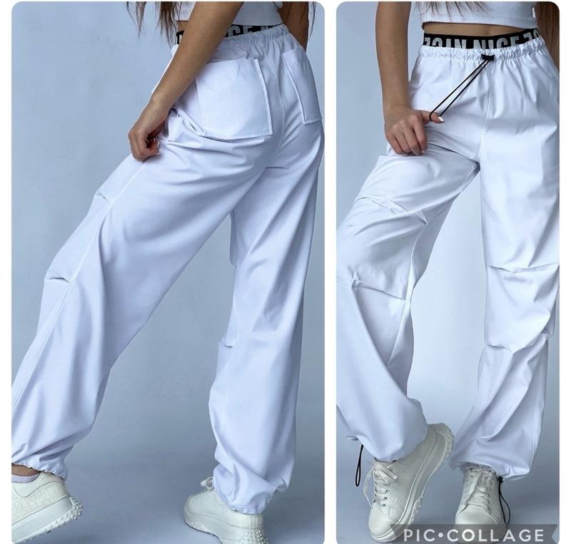 Тренд сезону! Брюки карго-парашуты. Внизу стягиваются на шнуровку. Пояс на резинке, есть утяжка. Есть карманы. Ткань -турецкий коттон. Замеры: 158 длина - 97см, шаг - 71см, пояс- 30см, полуобхват бедер - 46см. 164 длина - 100см, шаг - 73см, пояс- 31см, полуобхват бедер - 47см. Мс