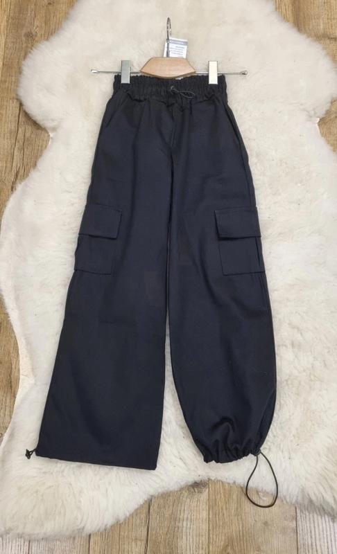 Трендовые брюки карго. Пояс на резинке, утяжка. Внизу брюк есть утяжка. Тканина - плотний джинс котон. Замеры: 140 длина - 85см, шаг- 64см, пояс - 26см. 146 длина - 89см, шаг- 67см, пояс - 27см. 164 длина - 102см, шаг- 81см, пояс - 31см. Мс