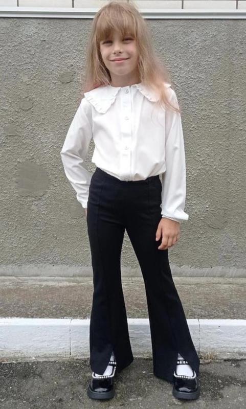 В НАЯВНОСТІ 🙌 дошили размеров подходит в качестве варианта в школу. будет хорошо смотреться с белой блузой Модные брюки клеш с разрезами Тканина трикотаж алекс Хорошо держат форму и круто сочетаются с любым верхом Модель идет приталенная как лосины, к низу клеш цвет: классический черный 🖤 Цена 600 грн 116 - 4 шт 122 - 6 шт 128 - 13 шт 134 - 15 шт 140 - 16 шт 146 - 6 шт 152 - 5 шт Замеры 116 - Длина 69 см, шаг 50 см, бедра 28 см 122- Длина 72 см, шаг 52 см, бежевое 29 см 128 -Длина 75см, шаг 54см, бедра 30см 134- Длина 79 см, шаг 58 см, бежевое 31 см 140- Длина 83 см, шаг 61 см, бежевое 32 см 146- Длина 86см, шаг 65см, бедра 33см 152-Длина 92см Шаг 68 см Бедра 35 см