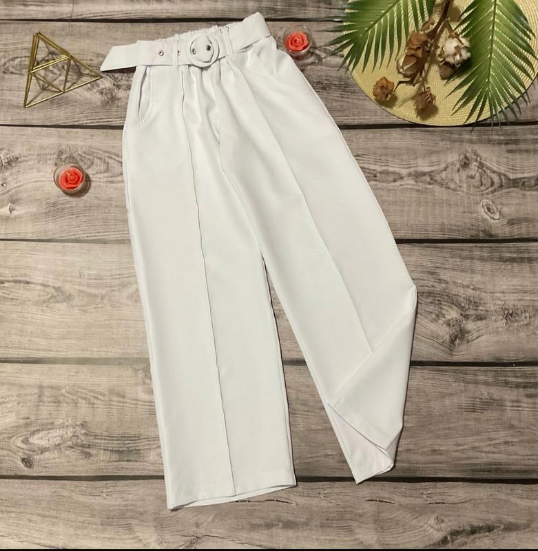 Стильные брюки для девушек Пояс на широкой резинке, есть карманы, пояс в комплекте. Тканина: костюмна. Цвет - белый. Замеры: 146 штаны длина - 87см, шаг - 66см, пояс - 27см.