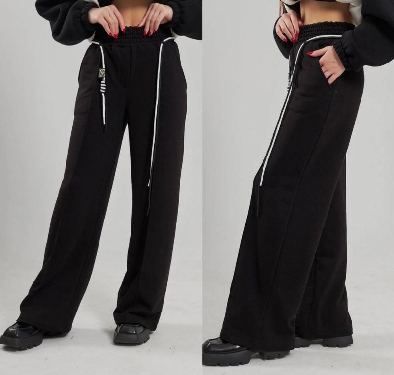 Штани палаццо Спереді вистрочені оздоблюючим швом. Пояс - чорно-білий шнурок (в комплекті) Пояс на широкій резинці. Є кишені. Тканина - турецька двонитка петля, дуже гарної якості. Заміри: 140 довжина - 89см, крок - 63см, пояс - 26см, напівобхват бедер - 47см. 146 довжина - 91см, крок - 64см, пояс - 28см, напівобхват бедер - 48см. 164 довжина - 104см, крок - 75см, пояс - 33см, напівобхват бедер - 51см. Мс