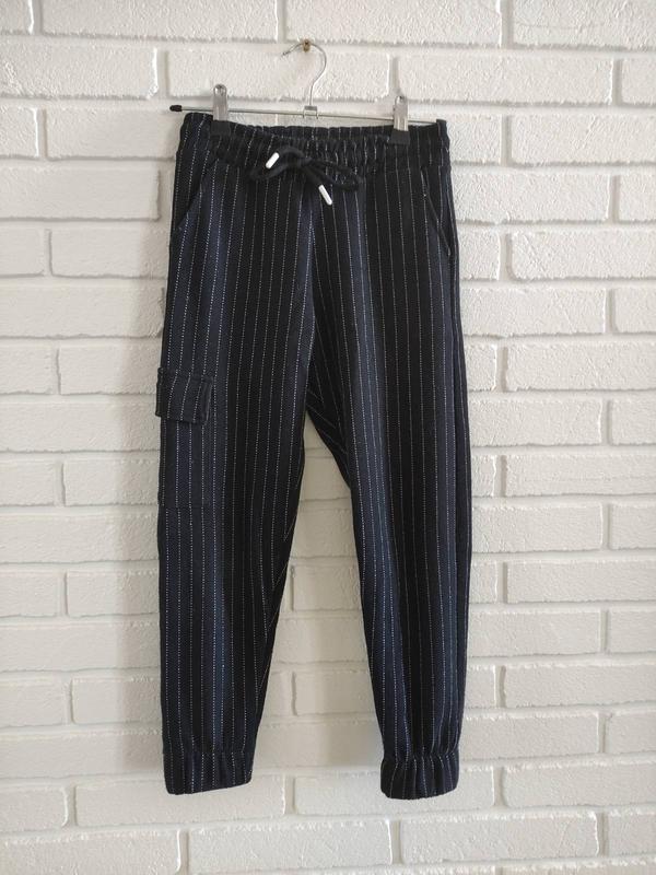 Брюки для девочки в хорошем состоянии. Размер на брюках 140 (9-10 лет), но идут на 128-134 (8 лет, так и носили) Ткань плотная, подойдут на холодную осень-весну или даже теплую зиму. Состав: 50% хлопок, 45% полиэстер, 5% эластан. Не мнутся) Цвет: черные в белую полосочку В талии резинка+дополнительно шнурочком можно регулировать. Боковые карманы, книзу немного уже. ПОТ – 27,5 длина - 74 шаговый – 54 Отправка укрпочтой, новой почтой