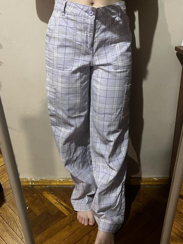 Джинсы -карго в клетку в фиалково-фисташковый цвет. Средняя посадка. Есть дополнительная пуговица. 100% бавовна. 34 размер (xs)