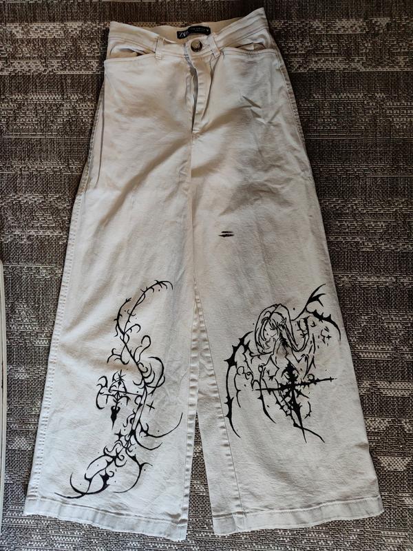 Брюки от бреда Зара,с росписью Едини в своем роде длина 96 ширина по талии 32(64) ширина внизу 32 кофта в подарок