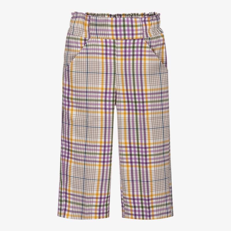 Брюки Mayoral для девочки в клетку фиолетового цвета и цвета слоновой кости из мягкой смеси вискозы с оттенками желтого, зеленого и бежевого. Эти широкие брюки имеют наклонные передние карманы и эластичный пояс. Состав: 64% полиэстер, 34% вискоза, 2% эластан (мягкий, легкий). Стан идеален(одевалы несколько раз). Размер 4 года 104 см.