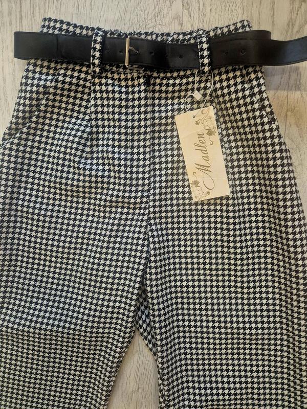 Брюки в трендову гусячу лапку. Поясок в комплекте. Новые, с биркой. Тканина жаккард. По наборке 158 размер, маломерят. Ориентируйтесь по замерам. Довжина 86 см, шаг 58 см, пояс 27 см. Сзади на резинке. Хорошо тянутся, стильные и удобные.