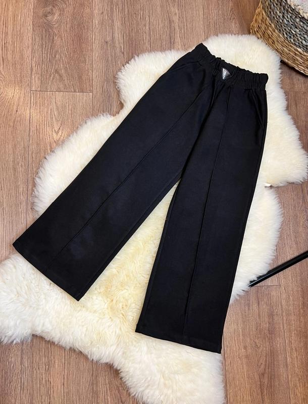 Модные Палаццо! Пояс на резинке. Есть карманы. Цвет - черный. Тканина -шерсть. Замеры: 140 - длина - 88см, шаг - 66см, пояс- 26см, полуобхват бедер - 45см. 146 - длина - 91см, шаг - 68см, пояс- 27см, полуобхват бедер - 46см. 152 - длина -95см, шаг - 71см, пояс- 29см, полуобхват бедер - 47см. 158 - длина -97см, шаг - 73см, пояс- 30см, полуобхват бедер - 49см. 164 - длина - 100см, шаг - 75см, пояс- 30см, полуобхват бедер - 51см. Мс
