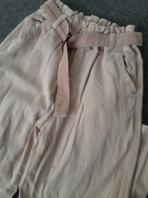 Стильная модель. Широкие, с поясом, на резинке. Очень красиво смотрятся. Материал классный, прочный, типа джинс. цвет - пудра замеры длина - 94 см крок - 62 см пояс в спокойном состоянии- 26 см, растягивается до 34 см ширина штанини внизу 23 см