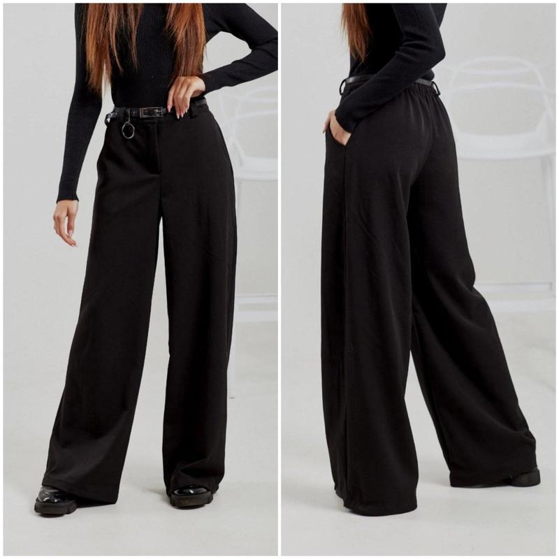 Брюки палаццо Есть карманы. Пояс по спинке на резинке. Цвет - черный. Ткань: плотный трикотаж с содержанием шерсти. Замеры: 140 длина - 90см, шаг - 64см, пояс - 29см, полуобхват бедер - 41см. 146 длина - 92см, шаг - 66см, пояс - 29см, полуобхват бедер - 45см. 152 длина - 99см, шаг - 69см, пояс - 30см, полуобхват бедер - 46см. 158 длина - 101см, шаг - 73см, пояс - 32см, полуобхват бедер - 48см. 164 длина - 103см, шаг - 74см, пояс - 35см, полуобхват бедер - 50см.