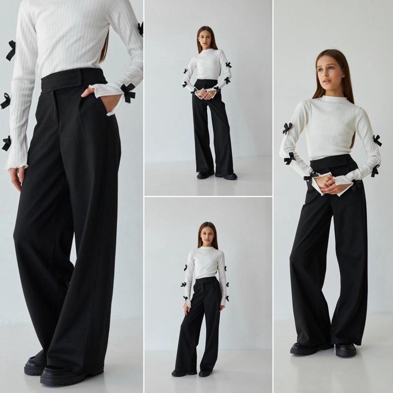 ток 1110 грн Палаццо , тканина шерсть гарної якості чорного кольору , гарно спадає, приємна до тіла . Спереді штанішок складочки, застібка на липучці з блискавкою, задня частина пояса на резінці. Лонгслів тканина мягкий трикотаж гарноі якості,хіт сезону - трендові бантики. заміри:довжина лонгсліва/пог/рукав/довжина/крок/пояс 134-39/30/55/87/63/27 146-43/34/60/94/69/30 158-45/37/64/102/76/31