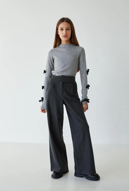 Палаццо , тканина шерсть хорошего качества темно-серого цвета, красиво ниспадает, приятная к телу . Спереди штанишек складочки, застежка на липучке, с молнией, задняя часть пояса на резинке. Лонгслив ткань мягкий трикотаж хорошего качества, хит сезона - трендовые бантики. замеры: длина лонгслива/пог/рукав/длина/шаг/пояс 134-39/30/55/87/63/27 140-40-32/56/91/65/28 146-43/34/60/94/69/30 152-43/36/62/97/72/31 Ток