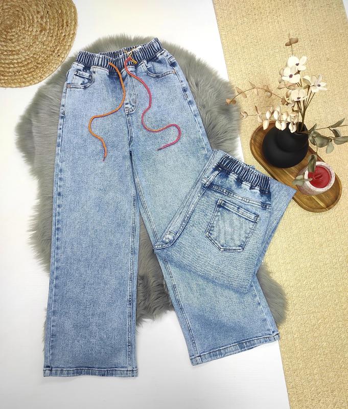 Модные джинсы ПАЛАЦЦО Ткань - качественный джинс Хорошо тянутся, высокая посадка Цвет - голубой Пояс на резиночке КАЧЕСТВО ЧУДОВА!! РЕКОМЕНДУЮ!!! замеры: длина/шак/пот/поб 22(134-140)-88/60/26/42 23(140-146)-89/64/27/43 24(146-152)-98/69/29/44 25(152-158)-102/72/31/45 26(158-164)-104/73/32/46 27(164-170)-106/75/32/47 +-2 см